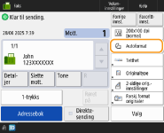 Når det oppstår en overføringsfeil fordi mottakerens linje er opptattMaskinen ringer på nytt automatisk etter en viss tid. Du kan endre innstillinger som hvor mange ganger maskinen ringer på nytt, og intervallet mellom repetisjonene.<Auto repetisjon>