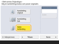Hvis størrelsen som vises i <Originalformat> er en annen enn størrelsen på boken, trykker du på <Endre> for å velge størrelsen. Du kan angi sletting av bokkanter kun for originalstørrelsene som vises på berøringspanelskjermen.