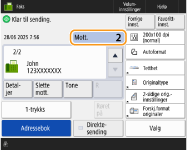 Faks/I-faks sendejobber: <Kvalitetprioritet> (<Hastighet/bildekvalitetprioritet for svart-hvitt-skanning>)Når flere telefonlinjer er angittDu kan velge telefonlinjen som skal brukes for å sende fakser ved å trykke på <Valg>