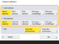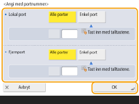 Trykk på <Angi etter portnummer> for å bruke portnumrene når du angir portene som IPSec brukes på. Velg <Alle porter> for å bruke IPSec til alle portnummer. For å bruke IPSec til et bestemt portnummer, trykker du på <Enkel port> og angir portnummeret. Etter du har angitt portene, trykker du på <OK>. Angi porten til denne maskinen i <Lokal port> og angi porten til kommunikasjonsnettet i <Fjernport>.