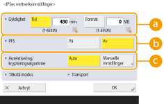 Hvis du stiller PFS (Perfect Forward Secrecy)-funksjonen på <På>, økes hemmeligholdet til krypteringsnøkkelen, men kommunikasjonshastigheten blir tregere. I tillegg må PFS-funksjonen være aktivert på kommunikasjonsnett-enheten.