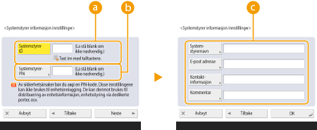 Når avdelings-ID-styring er aktivert, må avdelings-ID-er angis for brukere før de kan logge på. Systemstyrer-ID og systemstyrer-PIN-koden er begge satt til "7654321" som standard, men det anbefales å endre dem av sikkerhetsgrunner. Følg prosedyren nedenfor for å endre dem.