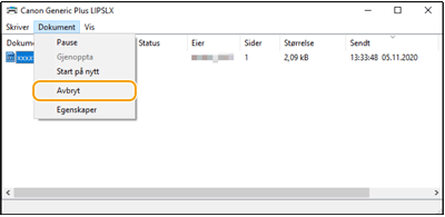 Hvis du ikke finner dokumentet som skal avbrytes, er dokumentet allerede sendt til maskinen. Da kan du ikke avbryte utskriften på datamaskinen.