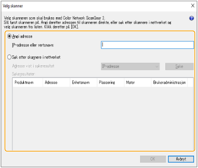 Klikk på [Angi adresse] og skriv inn IP-adressen eller vertsnavn til maskinen i tekstboksen [IP-adresse eller vertsnavn].