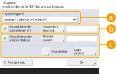 Velg krypteringsnivå. Hvis du vil bruker <Acrobat 9.0 el. tilsvarende/256-bit AES> i stedet for <Acrobat 10.0 eller tilsvar./256-bit AES> som krypteringsnivå, bruker du denne innstillingen til å endre valgene du kan gjøre.