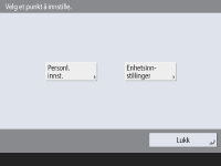 (Innst./Registrer). Hvis du velger <Personl. innst.> og endrer elementene som kan tilpasses personlig, registreres innstillingene som personlige innstillinger for brukeren som er logget på maskinen (Liste over elementer som kan personlig tilpasses). Hvis du velger <Enhetsinnstillinger>, registreres innstillingene som maskinens innstillinger. Hvis du logger på som en bruker uten administratorrettigheter og endrer innstillinger som kan tilpasses personlig, registreres innstillingene som personlige innstillinger uten å bli registrert som enhetsinnstillinger, akkurat som når du velger <Personl. innst.>.