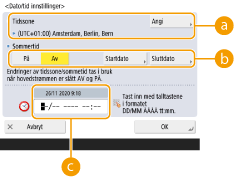 Hvis du endret innstillingen for <Tidssone> eller <Sommertid>, må du starte maskinen på nytt ved å slå AV strømmen. Trykk på strømbryteren for å slå maskinen AV (Slå av maskinen). Når 10 eller flere sekunder har gått etter at berøringspanelet og indikatorer ble slått av, slår du maskinen på igjen (Slå på maskinen).