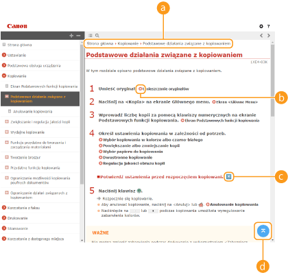 Kliknij, aby określić ustawienia, takie jak rozmiar tekstu, układ i metoda wyświetlania dla Podręcznik użytkownika.