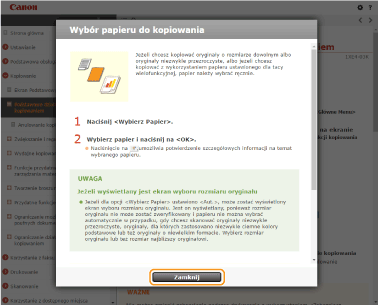 Po naciśnięciu na ikonę, aktualna strona może zostać zaciemniona i wyświetlone zostanie dodatkowe okno. Aby powrócić do strony, naciśnij [Zamknij] na wyświetlonym oknie.