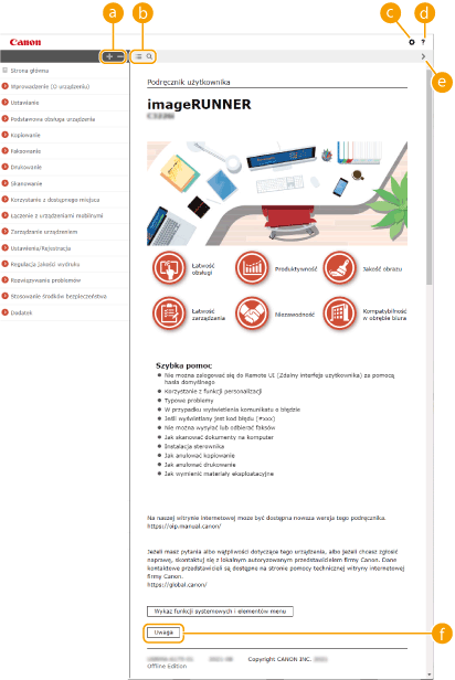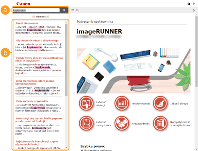 Kliknięcie tego elementu powoduje wyświetlenie instrukcji dotyczących otwierania Podręcznik użytkownika, wyszukiwania oraz innych informacji.
