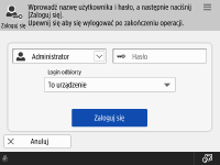 Po wyświetleniu ekranu logowania, zarejestrowani i autoryzowani użytkownicy muszą się zalogować, aby kontynuować eksploatację urządzenia. W celu zalogowania się każdy użytkownik musi podać własną nazwę użytkownika i hasło. Zapewnia to bezpieczeństwo użytkowania urządzenia. Ponadto użytkownicy mogą korzystać z urządzenia w sposób komfortowy, gdyż mogą dostosować (spersonalizować) zawartość wyświetlacza i ustawienia zgodnie z własnymi preferencjami. Elementy wyświetlane na ekranie logowania mogą się różnić, w zależności od ustawień zarządzania użytkownikiem. Należy przeprowadzić operację logowania, korzystając z wyświetlanych elementów.