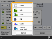 Można zarejestrować numer faksu odbiorcy lub adres e-mail, który może być wykorzystywany podczas wysyłania zeskanowanych dokumentów do Książki adresowej. Jako odbiorcę w Książce adresowej można też zarejestrować odbiorcę I-faksu, lokalizację katalogu serwera plików (adres IP i ścieżkę dostępu) oraz pamięć (Zaawansowana przestrzeń) drukarki wielofunkcyjnej firmy Canon w książce adresowej.