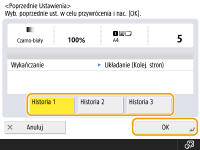 Można przywołać ostatnio wykorzystywane ustawienia kopiowania. Szczegóły dla przywołanych ustawień można zmienić przed rozpoczęciem kopiowania.