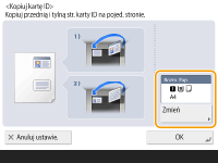 Ta funkcja umożliwia kopiowanie przedniej i tylnej strony dowodów tożsamości (kart ID) na jednym arkuszu papieru. Ta funkcja jest szczególnie przydatna podczas kopiowania kart ID (dowody osobiste, prawo jazdy itd.) ponieważ zorientowanie i pozycja druku obrazów obu stron karty jest automatycznie wyrównywana zgodnie z określonym formatem papieru.