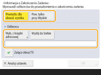 Aby wybrać <Wyślij do Siebie> jako odbiorcę, który zostanie powiadomiony, konieczne jest wcześniejsze zarejestrowanie adresu e-mail w informacjach o użytkowniku, a następnie zalogowanie się z wykorzystaniem zarządzania uwierzytelnianiem prywatnym. Rejestracja informacji o użytkowniku w urządzeniu lokalnym