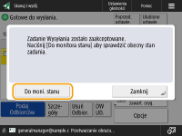 Jeżeli dla opcji <Wyświetl powiado. gdy zadanie zostało zaakceptowa.> wybrano ustawienie <Włącz>, ekran <Monitor stanu> można wyświetlić z poziomu poniższego ekranu wyświetlanego po odebraniu wysłanego zadania. <Wyświetl powiado. gdy zadanie zostało zaakceptowa.>