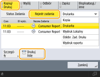 (Monitor stanu) wyświetlony zostanie ekran Monitor Stanu, który umożliwia sprawdzenie historii eksploatacji dla każdej funkcji, takiej jak kopiowanie, drukowanie, wysyłanie wiadomości e-mail, wysyłanie/odbieranie faksów/I-faksów itp. Na tym ekranie można również wydrukować historię eksploatacji dla każdej funkcji.