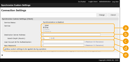 Naciśnij  (Ustaw./Rejestr.)  <Ustawienia Zarządzania>  <Zarządzanie Urządzeniem>  ustaw <Synchronizuj ustawienia niestandardowe (Klient)> na <Włącz>.