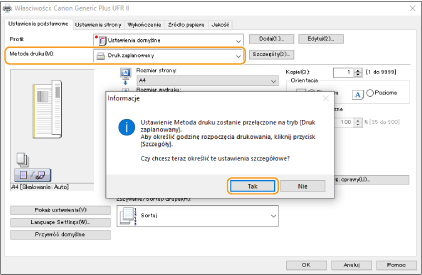 Wybierz [Druk zaplanowany] z poziomu [Metoda druku] i naciśnij [Tak].