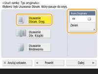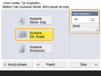 Jeżeli rozmiar wyświetlany w pozycji <Rozm.Oryginału> różni się od rozmiaru książki, naciśnij przycisk <Zmień>, aby wybrać rozmiar. Można skanować tylko formaty oryginałów wyświetlone na ekranie dotykowym.