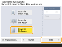 Jeżeli chcesz osobno wyregulować szerokość dla każdego obramowania, naciśnij <Usuń Obramow. Oryginału> lub <Usuwanie Obr. Książki> i naciśnij <Niezależna Regulacja>, aby wprowadzić szerokość usuwania.