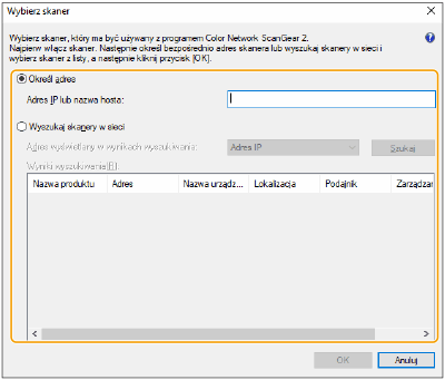 Naciśnij na [Określ adres] i wprowadź adres IP urządzenia lub nazwę hosta urządzenia w polu tekstowym [Adres IP lub nazwa hosta].