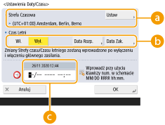Aby ustawić czas letni, naciśnij na <Włącz> i wprowadź datę i godzinę dla <Data Rozp.> i <Data Zak.>. Aby ustawić datę, określ dzień tygodnia i tydzień miesiąca.