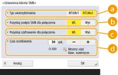 Jeśli dla opcji <Pozyskaj szyfrowanie dla połączenia> wybrano ustawienie <Włącz>, urządzenie może łączyć się tylko z serwerami SMB, które obsługują szyfrowaną komunikację SMB 3.0/3.1. Jeśli w pozycjach <1.0> i <2.0> wybrano ustawienie <Włącz> dla opcji <Podaj wersję klienta SMB>, ale w pozycji <3.0> nie wybrano ustawienia <Włącz>, urządzenie nie może połączyć się z serwerami SMB, które nie obsługują szyfrowanej komunikacji SMB 3.0.