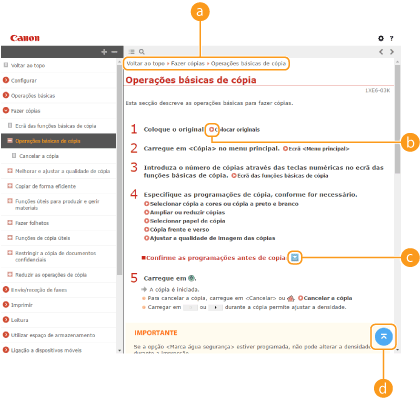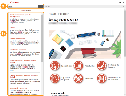 Clique para visualizar informações sobre como ver o Manual do utilizador, como efetuar uma procura e outras informações.