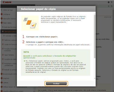 Quando clica no ícone, a página atual poderá ficar escura e uma janela de pop-up poderá aparecer. Para regressar à página, clique em [Fechar] na janela de pop-up.