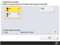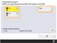 Se o tipo/formato de papel apresentado for diferente do tipo/formato de papel carregado, selecione a origem de papel onde o papel está colocado e carregue em <Prog>.