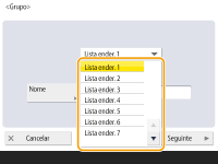 São apresentados os destinos gravados na lista de endereços que selecionou no passo 6. Nesta lista, selecione os destinos que pretende gravar num grupo.