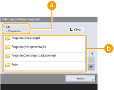 Carregue em  (Progrs./Gravar) para apresentar o ecrã <Programações/Grav.>. Carregue nesta tecla primeiro para efetuar alterações a cada programação como, por exemplo, nas programações do papel, nas programações de apresentação e nas programações de rede. Neste ecrã, também pode gravar destinos, como, por exemplo, endereços de correio eletrónico e números de fax.