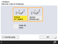 Ao copiar duas cópias ou mais a partir do alimentador, é possível selecionar a ordenação ou o agrupamento para a ordem das impressões. Selecione "Ordenar" para imprimir numa ordem de páginas sequencial. Selecione "Agrupar" para imprimir lotes de cada página como, por exemplo, 10 folhas para a primeira página, 10 folhas para a segunda página e assim sucessivamente.