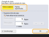 Para copiar páginas específicas, selecione <Páginas especificadas>. Introduza as páginas, carregando em <Pág. inic.> ou <Pág final>.