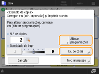 Carregue em <Alterar programações> para alterar as programações. <Ex. de cópia> é apresentado após a alteração das programações. Faça novamente a cópia de um exemplo.