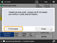 Se o item <Mostrar notificação quando trabalho for aceite> for programado para <Ligado>, é possível aceder ao ecrã <Contr. estado> a partir do ecrã seguinte que é mostrado após a receção de um trabalho de envio. <Mostrar notificação quando trabalho for aceite>