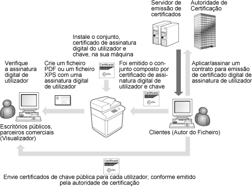Para adicionar uma assinatura digital de utilizador a um ficheiro PDF ou XPS criado com a sua máquina, deve primeiro instalar o certificado de assinatura digital de utilizador e o par de chaves emitido por uma autoridade de certificação para a máquina. O procedimento de operações é apresentado abaixo.