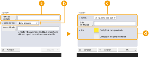 Selecione como lidar com os documentos que correspondam às condições. Quando seleciona a opção <Em esp. como trab. part.>, pode programar <ID de substituição> para especificar o nome de utilizador colocado no registo ao imprimir. Selecione <Cancelar> para descartar o documento.