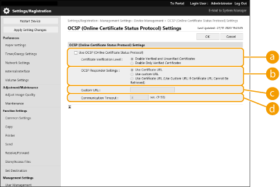 Existem dois métodos para verificar se os certificados recebidos da contraparte da comunicação são válidos: Comparar com a lista de revogação de certificados (CRL) registada na máquina e consultar um respondedor OCSP (protocolo de estado de certificados online), um servidor que suporta OCSP. Defina o método para verificar a validade dos certificados de acordo com o seu ambiente. Este registo só pode ser efetuado pelo administrador.