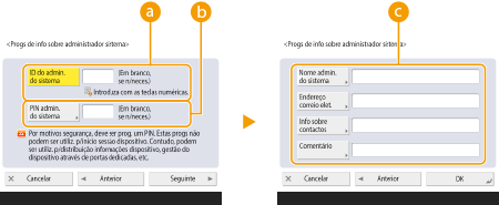 Também pode tornar obrigatória a introdução de sete dígitos para a ID do administrador do sistema e para o PIN do administrador do sistema. Para obter mais informações, contacte o seu revendedor ou representante de serviços.