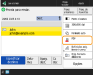 Os documentos <PDF; Compacto>, <PDF; vetorial>, <XPS; Compacto>, ou <Word> para os quais <OOXML> está definido, só podem ser enviados com as seguintes definições: