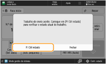 Se o item <Mostrar notificação quando trabalho for aceite> for programado para <Ligado>, é possível aceder ao ecrã <Contr. estado> a partir do ecrã seguinte que é mostrado após a receção de um trabalho de envio. <Mostrar notificação quando trabalho for aceite>