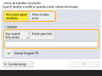 Pode receber uma mensagem de correio eletrónico a notificá-lo de que a operação de enviar/gravar documentos foi concluída. Mesmo que os documentos estejam à espera de ser enviados/gravados, pode utilizar o seu computador ou dispositivo portátil para verificar se o envio de documentos foi concluído, para ficar mais tranquilo. Se ocorrer algum erro, será notificado dos destinos cujos documentos não puderam ser enviados/gravados.