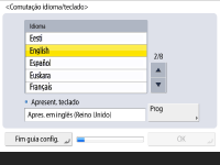 Selecione o idioma a ser apresentado nos ecrãs. Consoante o idioma, pode alterar a apresentação do teclado que aparece para introduzir carateres.