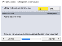 Carregue em <Ligado> para utilizar o endereço sem continuidade ou em <Desligado> para não utilizar o endereço sem continuidade e depois em <Seguinte>.