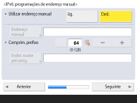 Para utilizar o endereço manual, carregue em <Endereço manual>, <Comprim. prefixo> e <Ender. router pré-prog.> para introduzir cada valor.