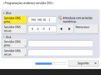Carregue em <Servidor DNS princ.> e <Servidor DNS secun.>, introduza o endereço IPv4/IPv6 do servidor DNS e carregue em <Seguinte>.