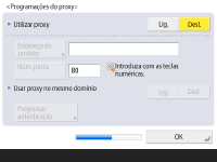 Para utilizar o proxy, carregue em <Ligado>, depois em <Endereço do servidor> e em <Núm. porta> para introduzir cada valor e, por último, em <OK>.