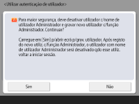 Para melhorar a segurança da máquina desativando o utilizador "Administrator" e gravando um novo administrador, carregue em <Sim>. Em <Gravar administrador>, introduza <Nome do utilizador> e <Password>, e carregue em <OK>. Especifique <Endereço correio elet.>, <ID dept.> e <Mostrar nome>, conforme for necessário. Para mais informações, consulte Gravação de informações do utilizador no dispositivo local. O utilizador "Administrator" será desativado na próxima vez que iniciar sessão.
